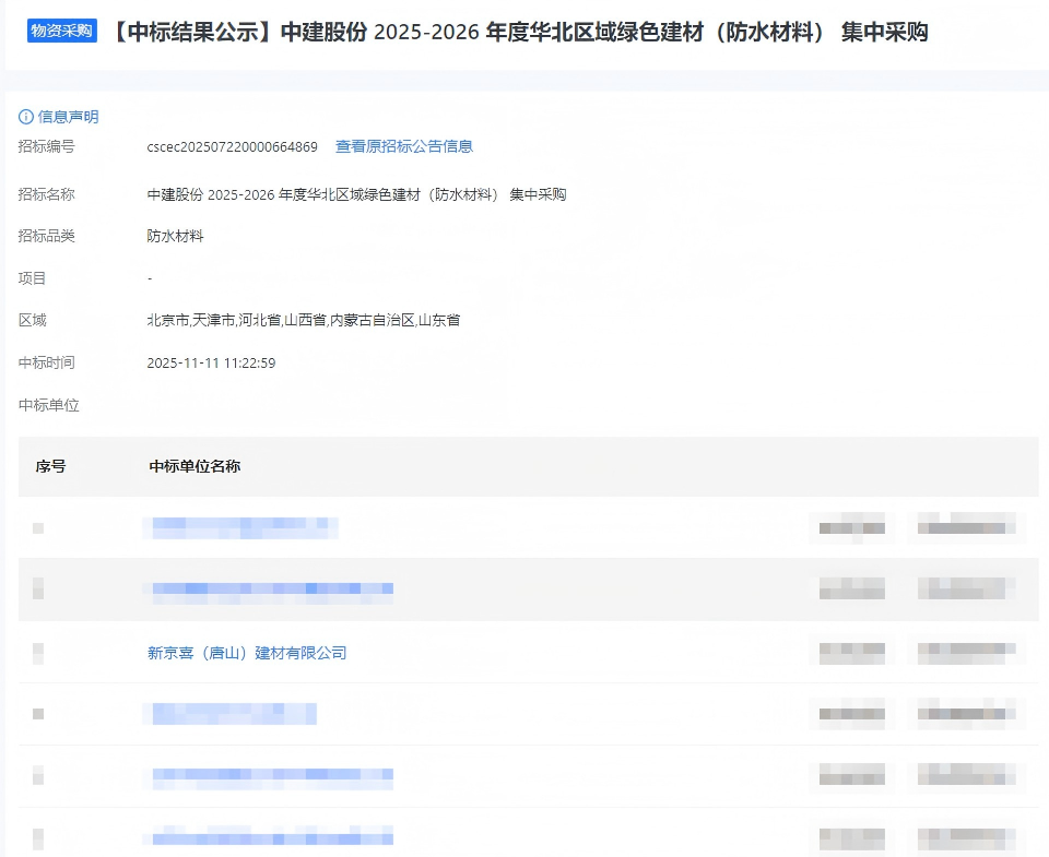 近日,經過嚴謹公正的多輪篩選與評估,京喜防水憑借綠色防水材料領域的創新研發、卓越性能與系統化解決方案,成功入圍中國建筑股份有限公司2025-2026年度華北區域綠色建材(防水材料)集采項目。